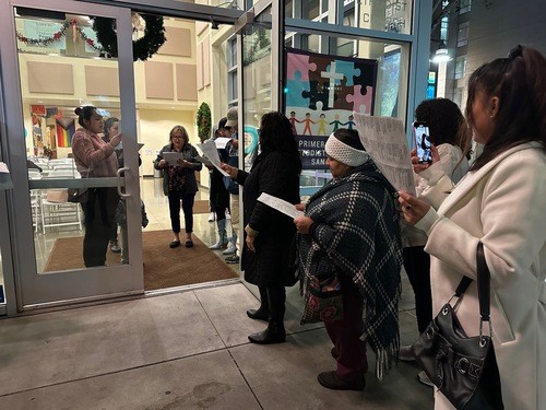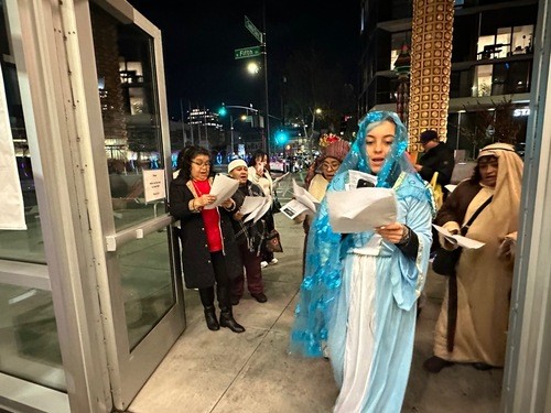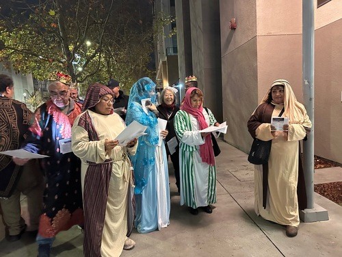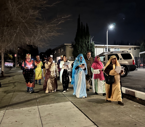 The evening began with a gathering of parishioners from La Primera Iglesia and our church. There were only five from our church, Rev. John Oda (Sir Hennessy and Brin), Mark Teagle, Bev and Hector Acuna, and Barbara Hiura) and the group from La Primera Iglesia were costumed as Joseph, Mary, the three magi, shepherds, and God’s Holy Angel. With Mark Teagle wheeling a music box, we sang English and Hispanic Christmas carols as we trekked from our church to theirs. Upon arrival, Mary and Joseph were denied entrance as they acted out what transpired in Bethlehem those many years ago. Upon entry, the troupe was greeted by 30 or so members of La Primera Iglesia and the story continued in their beautiful sanctuary. We sang songs in Spanish and English, and the liturgy done bilingually presented the Nativity story of Jesus’ birth. Rev. John Oda gave a brief message about the meaning of this Jesus experience and what this is for us right now and in everyday life noting that there are Godwinks surrounding us and everywhere, and when we pay attention, we are uplifted and Jesus fills us up.