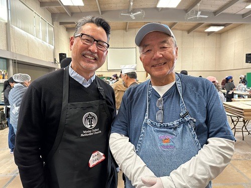 Rev. John even put on an apron, but there’s not a drop of mochi flour on him, standing here encouraging co-chair Dale Sasaki.