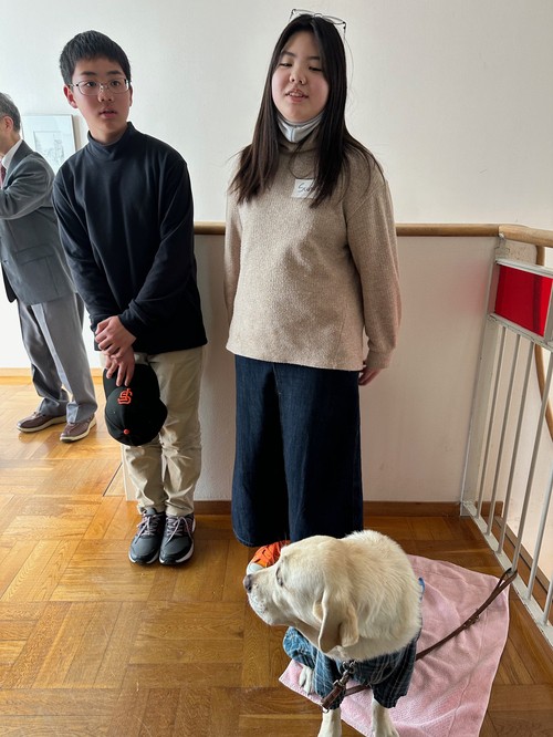 Ko and Sumire (they've grown up) with the church mascot Denisu