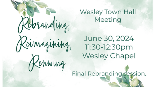 The other transition that Wesley is going through during the month of June, is the completion of our rebranding process. On June 30 at 11:30- 12:30 we will gather once more for a Town Hall Meeting in the chapel. The focus will be the conclusion of our rebranding process. Our rebranding process has honored the past, embraced the present, and has looked forward to a future filled with possibilities. The rebranding process has also represented our commitment to renewal, growth, and deeper connection with our community.