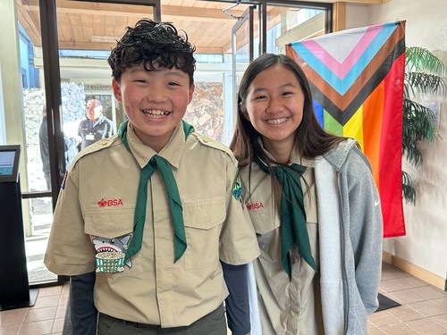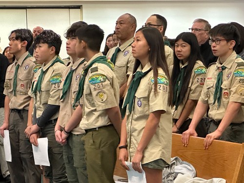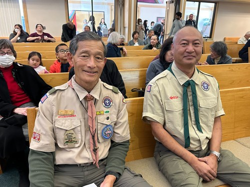 Troop leaders Tom Oda above left, who presented the goals of the scouting program, John Ng (above right), and Tina Urata (below) with supporter, Smiley Kai, were on hand to support their Troop.