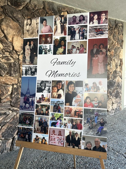 This is a beautiful Shimonishi family portrait of young love, marriage, children, travels, and celebrations which graced the front door of our church Fellowship doors as members walked by after service.