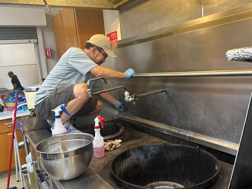 Tackling the yucky kitchen took elbow grease and hardwork with Tom Maeda (above) taking care of the wok area and Warren Uesato (below) cleaning the area around it sometimes with a toothbrush.