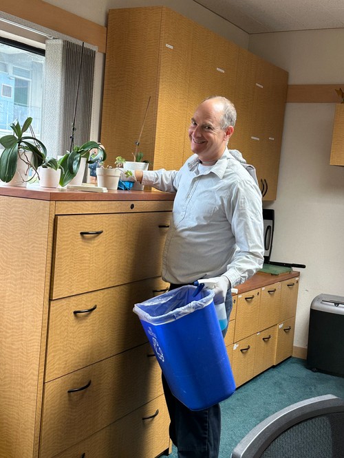 Always smiling, Brian Hamilton tidied up the Admin. office.