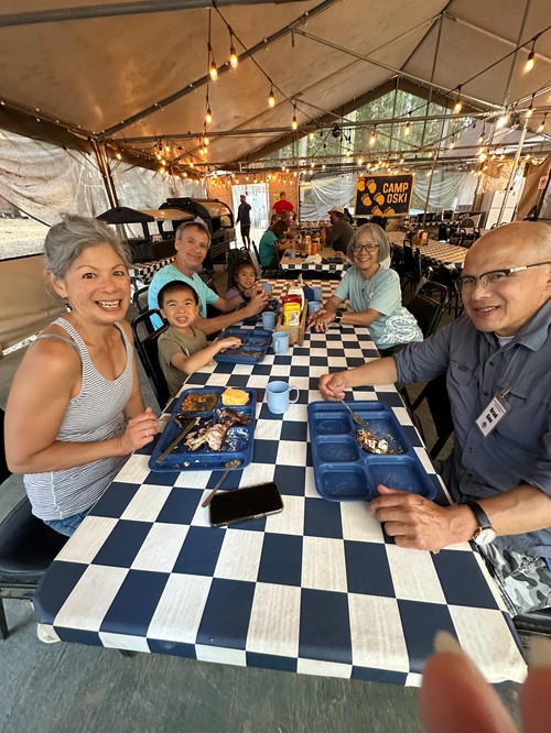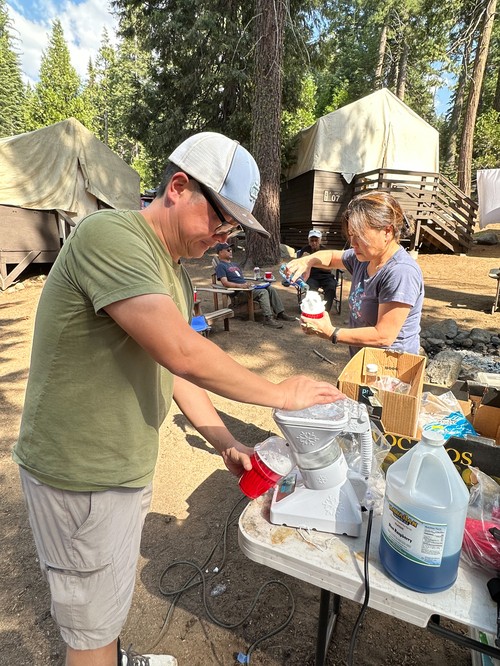 Two camps this year had local tent gatherings after this sing-a-long and s’mores. Camp A where many of the children and parents reside had movies, soy sauce hot dogs and rice. Yum! They also had an afternoon where they served snow-cones and expresso thanks to the Becky and David Wong, from Clovis.