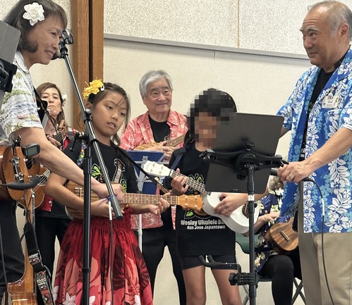 The Wesley Ukulele band performed and the crowd pleaser was "Hukilau" with from left: Art Black, Misao Kusuda, Dave Land, Catherine Bao, Bishop Sandra, Yumi Haraguchi, Teresa Truex, and John Oda joined our Hawaiian Hula dancers.